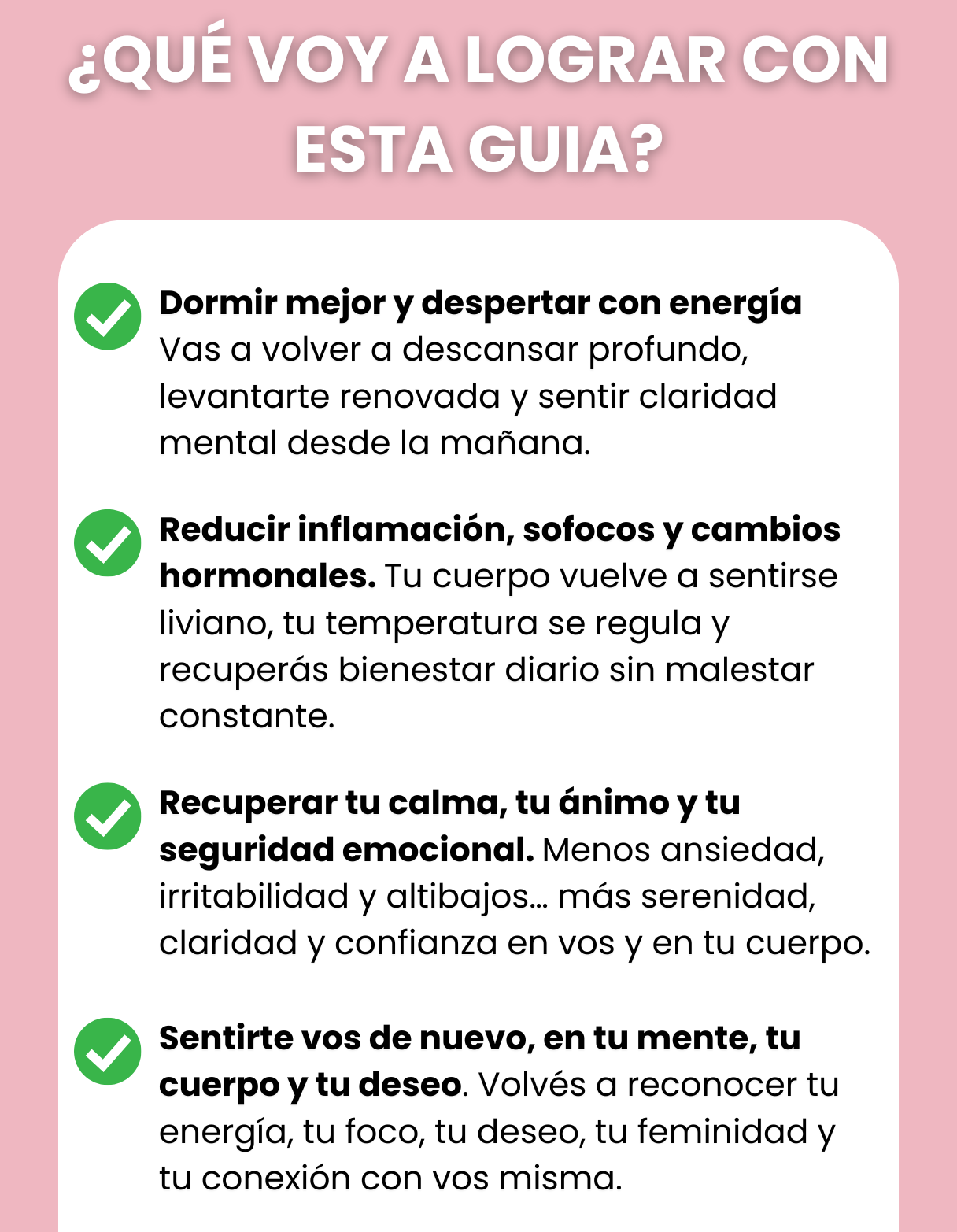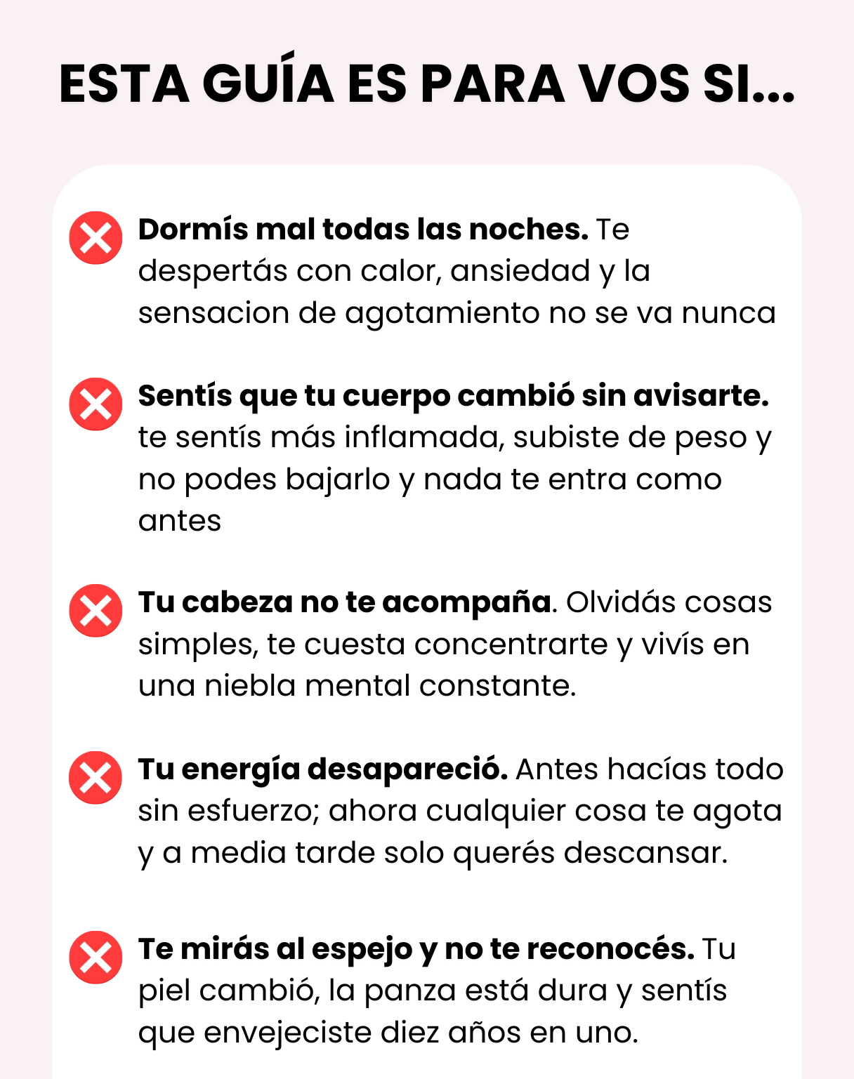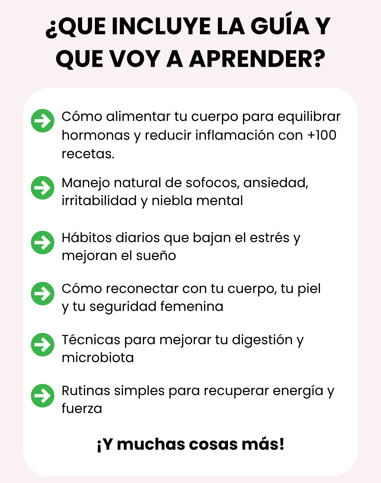 No. Esta guía está diseñada para acompañarte con alimentación, hábitos y bienestar emocional basados en evidencia, pero no reemplaza el acompañamiento profesional individual cuando sea necesario.